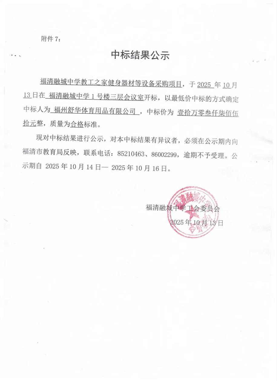 福清融城中学教工之家健身器材等设备采购项目招标公告